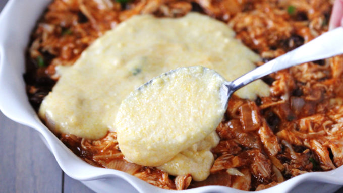 Step4In a separate bowl, whisk together cornbread mix, milk, egg and melted butter until combined and smooth. Then spoon the mixture on top of the enchilada mixture until the entire pie is covered.