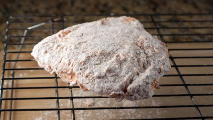 Step3Working with one chop at a time, dredge it in flour, then dip it in eggs, then back in the flour. Pat the flour down on the chops for a bit to make sure plenty of flour sticks to the chops.
