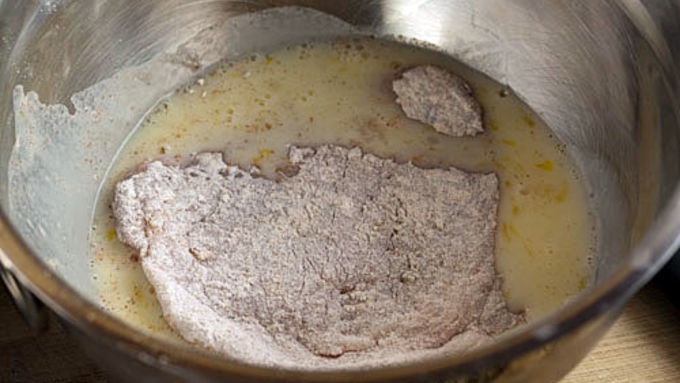 Step2Mix flour with paprika, salt, and pepper. Whisk eggs together in a separate bowl and add a few tablespoons of water to the eggs.