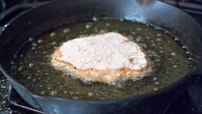 - Get your fork and knife ready, these Chicken Fried Pork Chops are the crispy, crunchy dish of your dreams. For this recipe you should go with the boneless variety if you can. A good pork chop should be pretty thick. While this is good for grilling, we'd recommend pounding them out a bit thinner before chicken-frying them. If your chop has fat around the outside, you can cut it off or leave it on. When you’re ready to cook, dredge each pork chop in the flour first. This will just kind of dry off the surface of the chop and make sure the egg can stick to it. After you've finished dredging the pork chop it's important to let the chop rest on a wire rack or plate for about five minutes. This resting time will give the crust a chance to dry on the pork chop. This prevents the classic problem where the entire crust comes off in one bite! As far as frying goes, we recommend using a cast iron skillet or Dutch oven to fry these guys. You need enough oil to go halfway up the chops as they fry. A quart of oil will be more than enough. A good test to see if your oil is hot enough is to sprinkle some flour it the pan. It should sizzle like crazy. Then you can add your chops! Cook them two at a time so they don’t crowd the pan. It’ll need to cook for about 5 minutes per side. As long as the juices are clear, it should be fine. If you’re in doubt, definitely cut into one of the finished ones to make sure they are done before serving them. Like I said, five minutes per side was perfect for mine though. You’re looking for a perfectly golden brown chop. After adding the flour and mixing the roux for the gravy, be sure to slowly add the milk. It’s important to add it slowly and whisk like crazy so the gravy doesn’t form lumps! Serve the chops slathered in the pan gravy – you are in for a treat! The crust on these is kind of spicy and really crunchy which is nice. The pork chop is super tender and juicy.