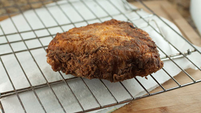 Step6Remove chops to a rack or paper towel to drain. Fry other two chops.