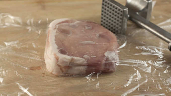 Step1To prep pork chops, cut off any excessive fat if you want. You can leave it on though too. Place the chops between two pieces of plastic wrap and pound them to an even thickness, about 1/3-1/2 inch thick.