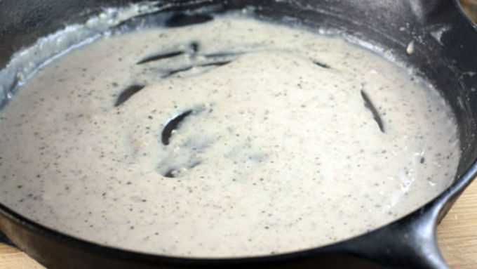 Step9Slowly whisk in milk. Whisk constantly. Whisk out any lumps that form and continue to whisk until gravy thickens. About 3 cups of milk will probably give you a really good gravy, but you might need more or less depending on your roux. Whisk in a pinch of salt and pepper to season roux.