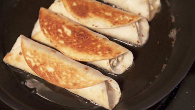 Step5Add oil to a large skillet over medium heat. Once the oil is hot, add about four taquitos into the pan with the seam side down to the taquitos seal nicely. Cook taquitos for about 2-3 minutes per side (just flip once).