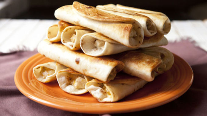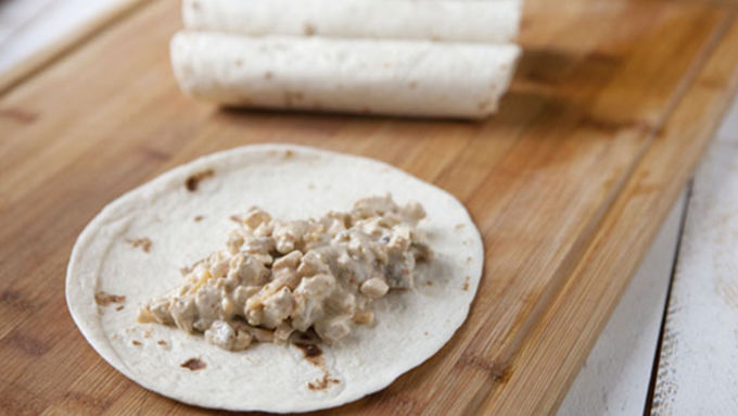 Step4Working with one flour tortilla at a time, add a few tablespoons of chicken mixture to the center of the tortilla. Roll the tortilla up tightly.