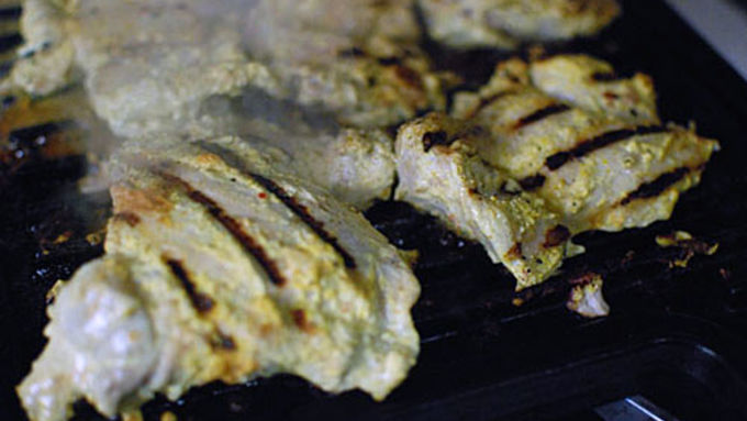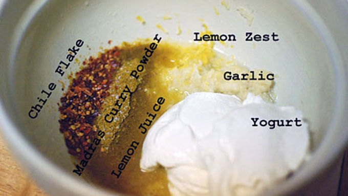Step1Make marinade: Mix 1 1/2 cups yogurt with chile flake, curry powder, juice of 1 lemon, zest of one lemon, salt and pepper. Poke chicken with a fork to help marinade fully flavor the chicken. Mix the chicken in to the marinade and let sit at least an hour, up to 12 hours.