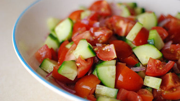 Step4Make Salad: Chop tomatoes, slice onions, chop cucumbers, season with salt and vinegar.