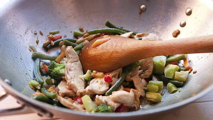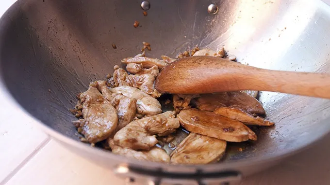 Step4Heat a large skillet or wok over medium-high heat. Once hot, add two tablespoons oil and swirl to coat pan. Then add chicken and cook for 3-4 minutes until chicken is cooked through. It should cook quickly if you sliced it thin.