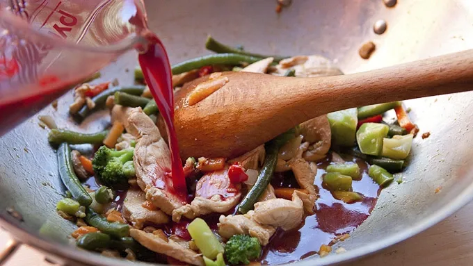 Step6Add sauce to the skillet or wok and stir. The sauce should thicken after a minute or two.
