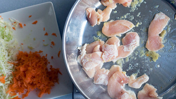 Step5Preheat a large skillet on high heat and add vegetable oil and ginger, cook for approx 1 min, stirring to make sure ginger doesn’t burn. Add chicken and sauté until just cooked through.
