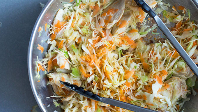 Step6Add in the cabbage and carrot and cook until it just barely starts to wilt, about 1 minute.