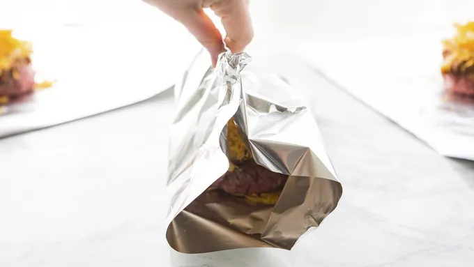Step4Bring up 2 sides of the foil so the edges meet. Fold together tightly at the top, creating a loose tent above the burger.