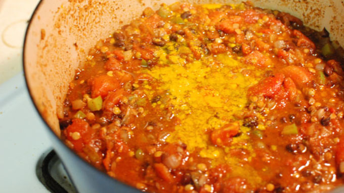 Step4Rinse the lentils and add them. Add the black beans, honey, and turmeric.