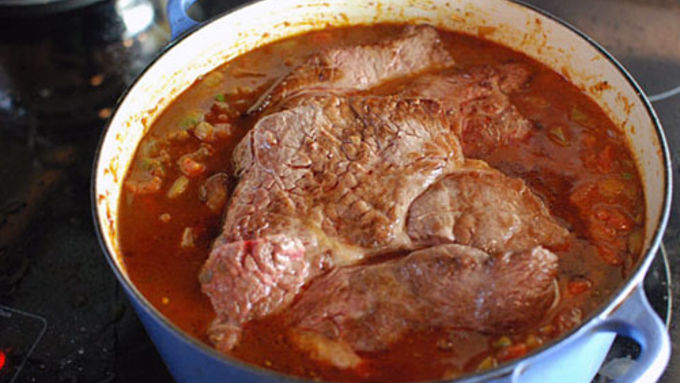 Step3Add the tomatoes, chiles, and one cup of the beef stock. Place the seared beef on to the top of the stew. Add some more stock if it seems too dry. Place the pot into the oven at 300°F for 3 to 4 hours until the meat is tender.