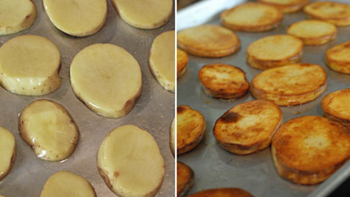 Step6Slice your potatoes into about 1/3 inch thick rounds. Coat in vegetable oil, salt, and spread on a sheet pan. Roast at 500°F for about 15 minutes, flipping once, to brown on both sides.