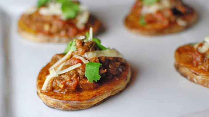 A twist on potato skins, these potato rounds are topped with braised beef chili and cheddar cheese.
