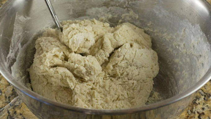 Step2Mix starter with other dough ingredients except flour. Stir together well and then slowly start to add flour. Once all the flour is added, bring the dough together in a ball.