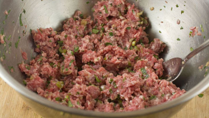 Step6For the filling, mince scallions, ginger, and cilantro very fine. Then stir with other filling ingredients and set aside until needed.