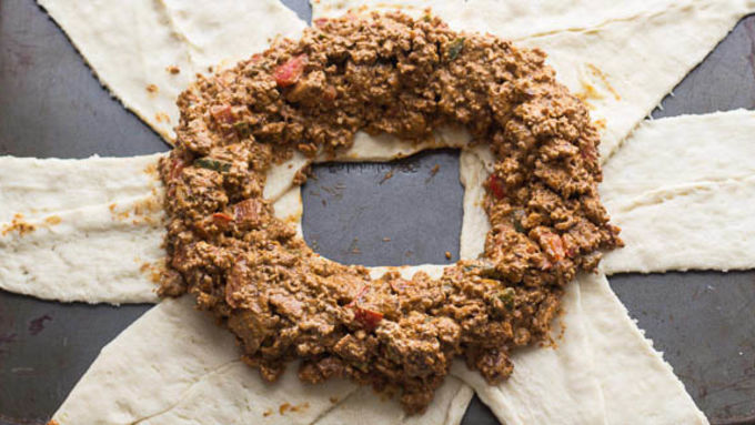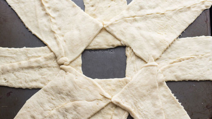 Step4Open the tubes of crescent rolls and separate each roll into four rectangles (pinch the seems of 2 two triangles together to make rectangles). Lay the rectangles on a parchment lined or nonstick baking sheet to form a large circle.