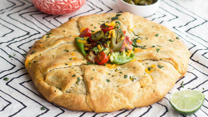 Step6Bake in preheated oven at 375°F for 15-20 minutes, or until golden brown. Let cool 5 minutes and then fill the center with lettuce, guacamole, salsa, pickled jalapenos and a sprinkle of cilantro and shredded cheddar cheese. Slice and serve!