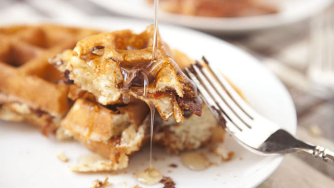- There are some flavors in the cooking world that are just made to be together forever. Strawberries and cream. Peanut butter and jelly. Bacon and chocolate. Yep. That’s right. I said bacon and chocolate. Maybe not as common as some of the others, but the two things work awesomely together. You would be remiss to not try a little chocolate on your bacon. Need a practical application? How about these Chocolate and Bacon Waffles!I’m a big fan of homemade waffles, but for this version I used Bisquick to get the job done faster. Depending on your waffle machine your cooking time will vary. Mine needed about five minutes to be really golden brown and delicious. I cut my waffle into quarters and then served it with lots of syrup. The waffle is a little crispy, and then you bite into the large pieces of bacon and sweet chocolate. It’s really delicious, and considering how fancy the waffle ends up, it’s actually not that much work. Give this a shot if you’re a waffle (or bacon or chocolate) fanatic!