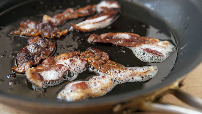 Step5Top the batter with big strips of bacon and chocolate chips.