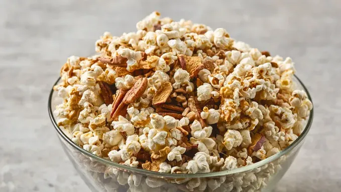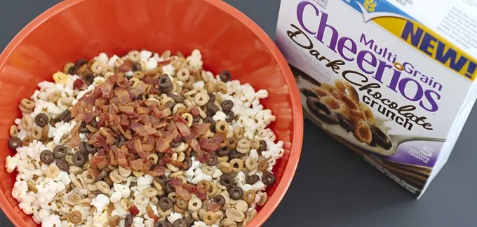 Step2In a large bowl, combine popcorn, cereal, peanuts and drained bacon pieces; toss lightly to combine.