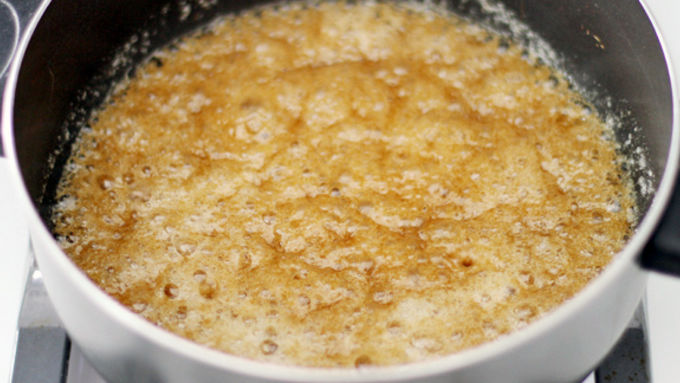 Step3In a large saucepan over medium heat, melt butter. Stir in brown sugar, corn syrup and salt. Bring to a boil over high heat, stirring constantly, then boil another 3 minutes without stirring. Remove saucepan from heat; stir in baking soda and vanilla.