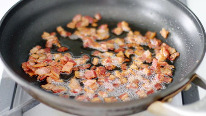 Step1Heat oven to 250°F. In a medium skillet over medium-low heat, cook bacon pieces until dark brown and crisp. Transfer to a paper towel-lined plate to drain.