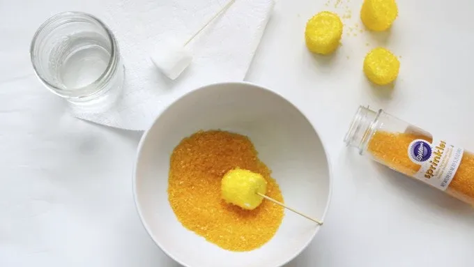 Step3Meanwhile, prepare the tail feathers. Pierce a marshmallow with a toothpick or skewer, quickly submerge it in a small glass of water, dab the excess water on a paper towel, and immediately coat it with sprinkles. (It’s helpful to hold the marshmallow over a bowl to catch extra sprinkles.) Carefully remove the toothpick and set the marshmallow on a piece of wax paper. Repeat for all the marshmallows, making five of each of these colors: red, orange and yellow. Allow the marshmallows to dry as long as possible.
