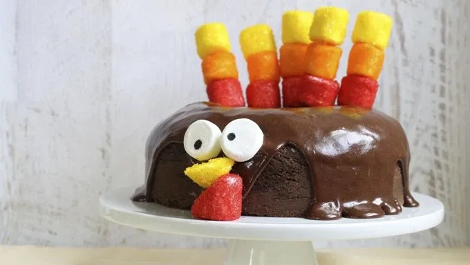 - Make this cute and easy Thanksgiving dessert and wow your family and friends!Seriously, this is a can-do holiday cake that's fun and best of all – easy! I have nothing against the typical Thanksgiving Day desserts. I’ll try the pies, maybe some pumpkin cheesecake, those syrupy cakes with cranberries and nuts and other harvest-themed things. But you just can’t beat a good, old fashioned chocolate cake. It’s what everyone really wants for dessert, especially those in the “no-fancy-flavors” crowd, such as the kids. Or my husband. And if you dress one up as a turkey (a cake, not my husband), then it totally counts as a Thanksgiving dessert. If you’ve never decorated a cake in your life, this turkey is a perfect place to start. It’s easy to put together for even the newest of decorators.First, you’ll need a cake pan. You can use a Bundt cake pan, though here I used an angel cake pan because I like the shape and it has two pieces so I can easily lift the cake out of the pan. Heck, you can even just make a double layer round cake if you like.