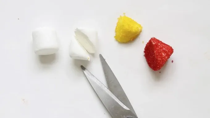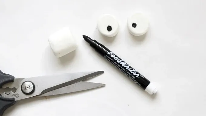Step5For the eyes, slice one marshmallow in half horizontally to make two marshmallow circles. On the non-cut ends, use the black edible writer to draw circles for pupils of the eyes.