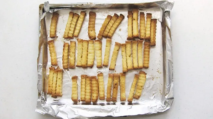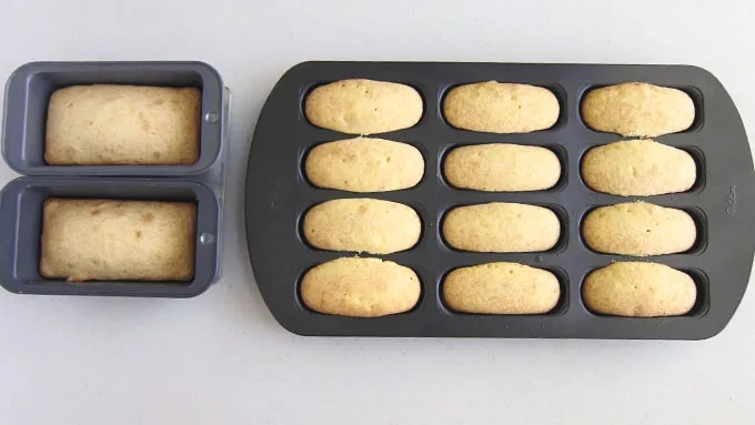 Step5Cool the small cakes in pan for 10 minutes, then remove and set on cooling rack to cool completely. Cut the two pound cakes into French fries, using a crinkle cutter or a knife. Drizzle half of the melted butter on an aluminum foil lined baking sheet, set the cake fries on the foil. Drizzle the remaining butter over top. Bake at 325°F for 15-20 minutes, flipping after 10 minutes, until deep golden brown.