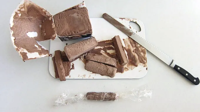 Step1Cut 12 slices of ice cream, 4-inch long by 1-inch wide and 1-inch deep. Cut a piece of plastic wrap and set one ice cream log at one edge. Roll the plastic wrap around the ice cream, rolling and shaping the ice cream into a hot dog shape. Twist the ends of the plastic wrap. Repeat. You’ll have a little excess ice cream. Freeze the ice cream hot dogs for at least 2 hours.