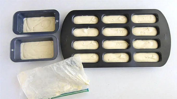 Step3Make Betty Crocker™ Pound Cake batter according to package instructions. Fill each of the 12 snack cake cavities 2/3 full of batter and divide the remaining batter among the loaf pans.