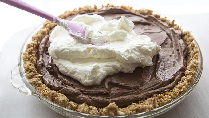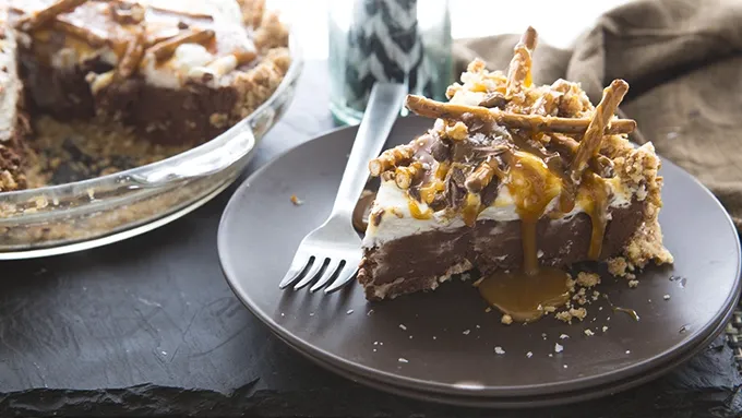 This decadent no-bake chocolate mousse pie is piled into a crust of crushed pretzels and topped with fresh whipped cream. A drizzle of salted caramel finishes off this simply splendid dessert.