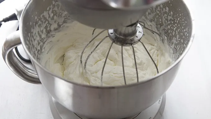 Step2In a stand mixer fitted with the whisk attachment, beat whipping cream until soft peaks form. Add powdered sugar and vanilla to the cream, whip until combined, then spoon 2 cups of the whipped cream into a small bowl, set aside.