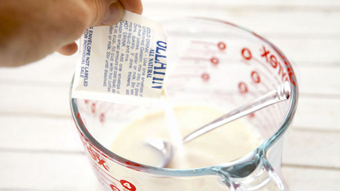 Step1Gently heat water and condensed milk in the microwave until it is steaming, but not foaming. Sprinkle in gelatin and stir well to melt the gelatin.