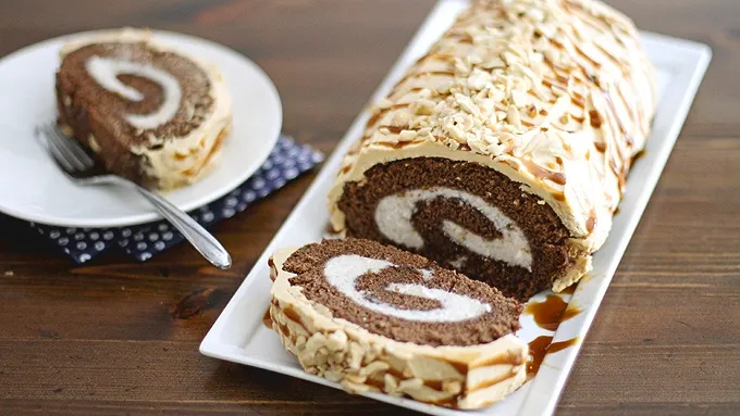 - Looks hard, but wait! Our step-by-step shows you how easy this treat is to make. When it comes to cake, there’s never too much of a good thing, amiright? That’s the thought process I went with into baking this amazing roll cake. A swirl of sweet banana filling in a moist milk chocolate cake, topped with a creamy peanut butter frosting, caramel drizzle and dry-roasted peanuts = UH YAASSSS. There’s a droolfest going on over here, that's for sure. Roll cakes used to intimidate me, but the truth is they are actually simple, and the results are so pretty! So that’s rad. But more importantly, this cake is so tasty, you just don’t want to miss out on it. So follow the steps here, and you’ll be on your way to caramel-chocolate-banana-peanut butter bliss. Slice using a very sharp, clean knife for the prettiest, swirliest, bestest slices. Serve cake chilled or at room temperature; it’s delicious either way! It’s that easy to get a roll cake in your life! And caramel, chocolate, banana and peanut butter in your belly all at the same time.