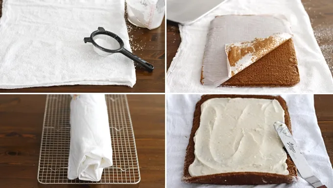 Step4Unroll a clean kitchen towel on a large surface; sprinkle with 2 tablespoons powdered sugar. Carefully invert warm cake onto towel; remove parchment paper. Roll up cake in towel like a log. Place on a cooling rack; cool 30 minutes. Carefully unroll cooled cake. Spread banana filling over cake to within 1/2-inch of edges. Carefully reroll cake and place on a serving plate. Chill cake at least 2 hours before frosting.