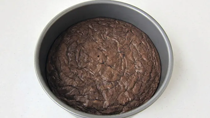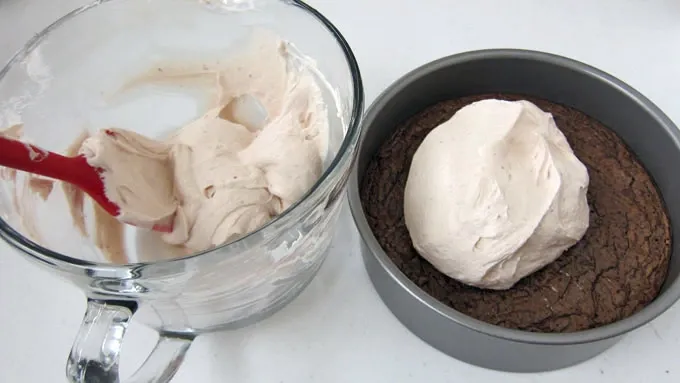 Step1Brownie layer: Spray inside of an 8-inch springform pan with baking spray. Preheat oven to 325° F if using a non-stick pan and 350° F if using a metal pan.