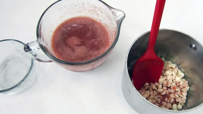 Step7Strawberry Cheesecake Mousse: Pour white chocolate chips and 2/3 cup strawberry puree into a saucepan and heat over low until melted.