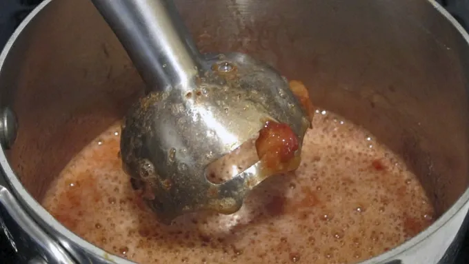 Step5Remove from heat and purée strawberries using an immersion blender (or pour into a blender and purée.)