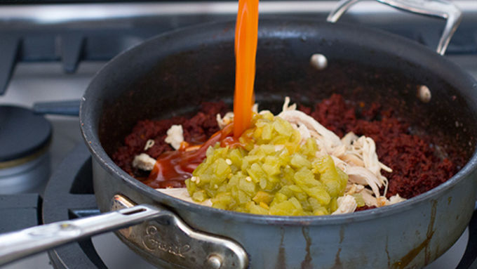 Step3In a large skillet, cook chorizo over medium heat until browned. Drain the grease well. Add the chicken, chopped roasted red peppers, green chilies, 3/4 cup of enchilada sauce and and 1 cup of cheese. Toss well and remove from the heat.
