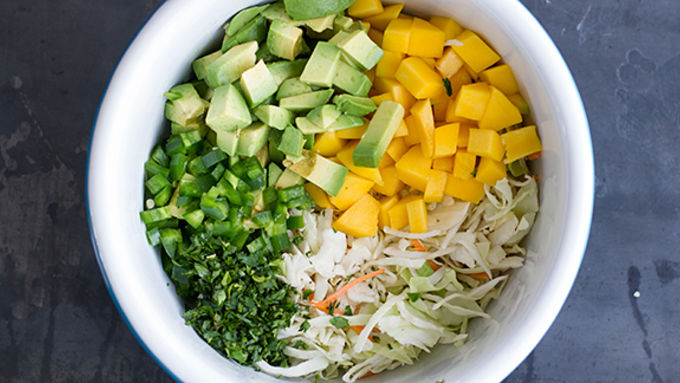 Step1In a large bowl combine cabbage, cilantro, jalapeno, mango and olive oil, toss to coat. Stir in avocado, and lime juice. Season to taste with salt, set aside.