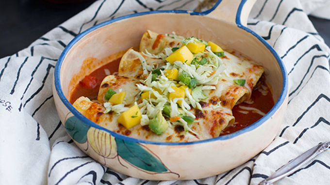 Step5Bake enchiladas about 30 minutes or until the cheese is bubbling and melted. To serve, place enchiladas on a plate and garnish with the mango slaw. Serve immediately.