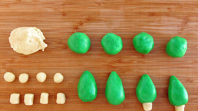 Step4Scoop out 14 tablespoonfuls of the red dough and 14 of the green dough. Roll into balls then shape into Christmas lights (like teardrops). Set on parchment paper lined baking sheets.