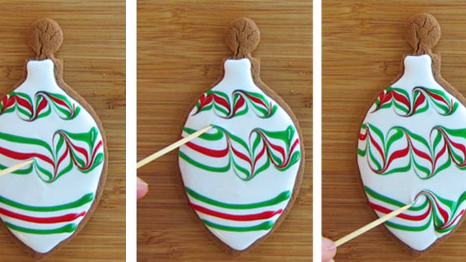 Step4Using the decorating icing, pipe an outline around the edge of one ornament cookie. Fill the center of the cookie with more icing. Shake the cookie so that the icing fills in completely. Immediately, pipe on lines of colored icing, then use a toothpick or skewer to swirl the colors.