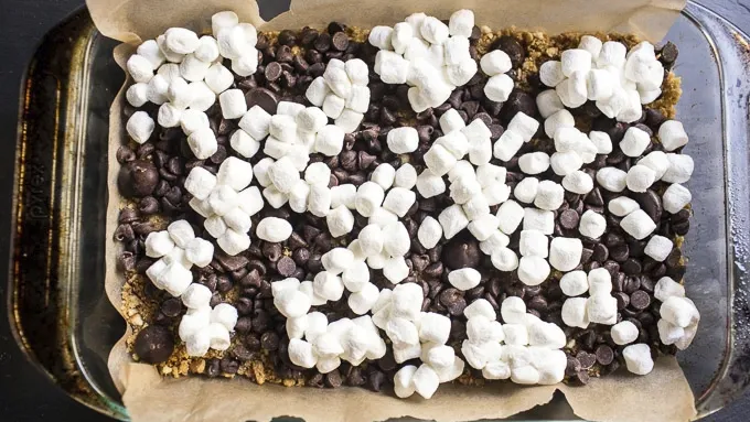 Step3Press crumbs into the bottom of the prepared baking dish. Sprinkle chocolate chips over graham cracker layer. Now sprinkle all but 1/2 cup of the mini M&M’S™ over the chocolate chips. Then sprinkle all but 1/2 cup of the mini marshmallows over the M&M’S™.