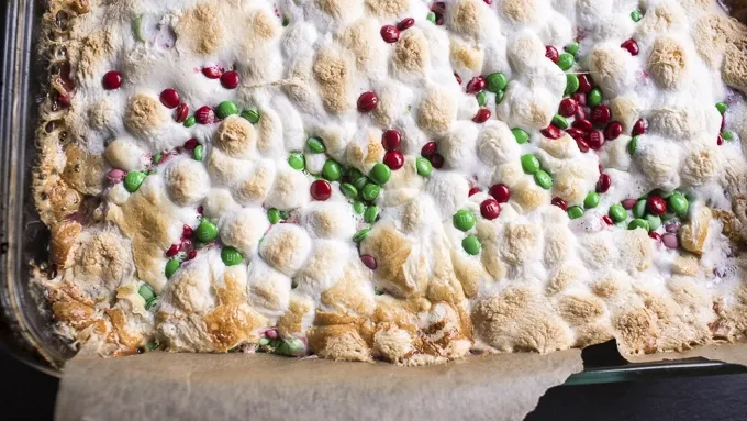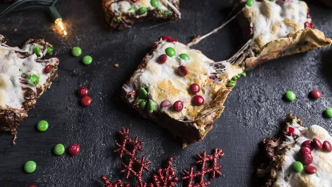 - Get in the holiday spirit with these easy Christmas S’mores. I know it may seem a bit early, but I’m ready to talk Christmas! Every single year Christmas just sneaks right up on me and it’s over before I can even bake a batch of cookies and drink some cold milk. So this year… I’m planning, prepping and baking a little early in hopes I can actually enjoy and experience Christmas the right way! Are you with me or what? Please say YES, cause I have the most delicious, most amazing and EASIEST Christmas S’more Bars in all the land to share with you today. These bars, inspired by Bombshell Bling’s recipe , are delicious beyond words, and so easy to prepare and completely fun for everyone involved! I think even Santa himself would fully approve. You can either serve this in a bowl as a warm and gooey dessert, or let cool and cut into bars. Personally, I love these warm and gooey with a cold glass of milk! These can easily be made for Halloween, Valentine’s Day and Easter, just use the appropriate M&M’S™. If you’re out of graham crackers, try using Ritz Crackers or pretzels crumbs in place.